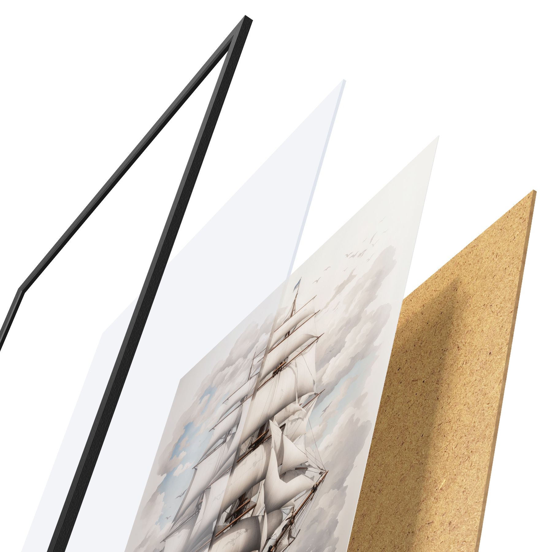 De poster bestaat uit een frame, plexiglas, geprinte afbeelding en spaanplaat achterkant. De poster kan meteen aan de muur worden gehangen dankzij de bevestigingen op de achterkant.