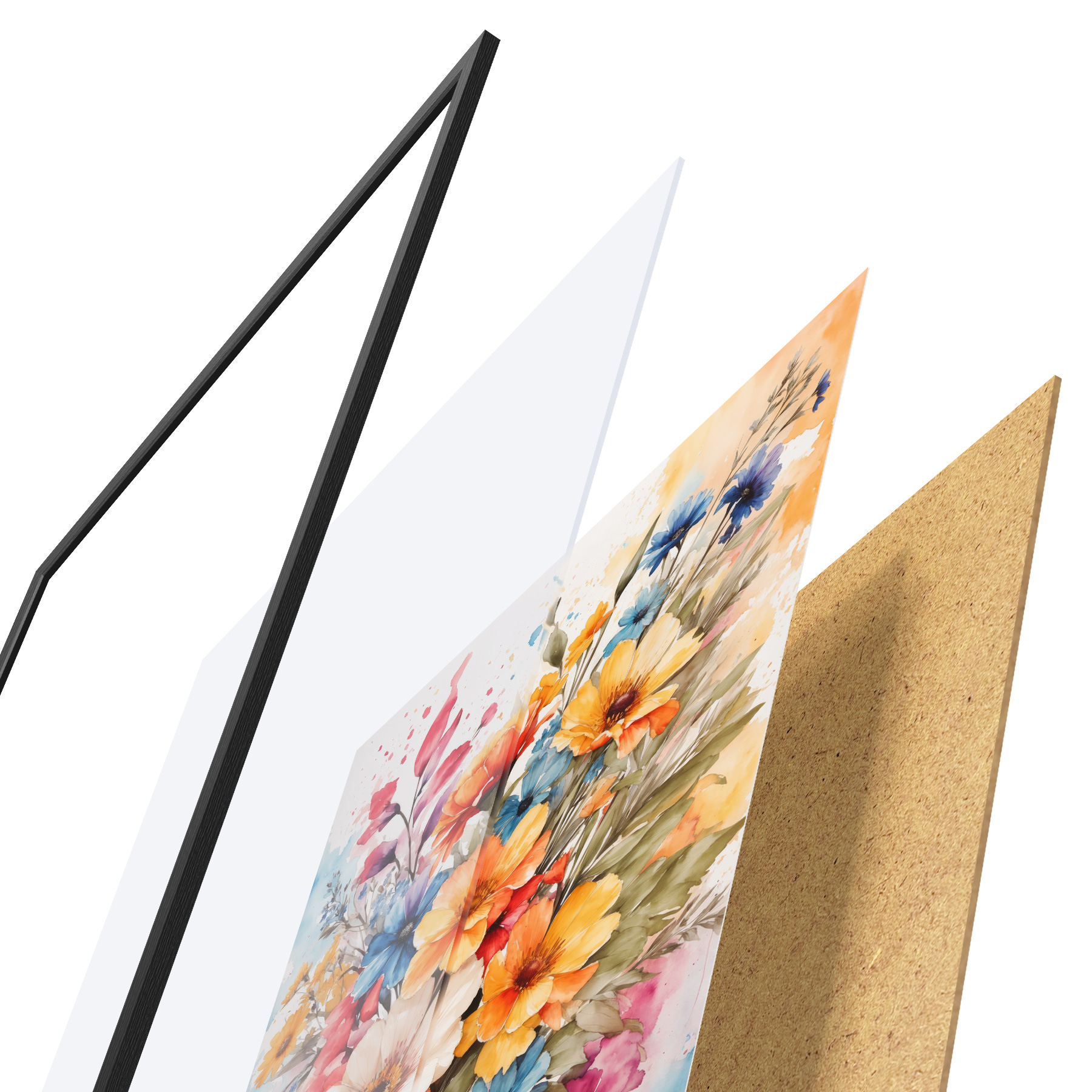 De poster bestaat uit een frame, plexiglas, geprinte afbeelding en spaanplaat achterkant. De poster kan meteen aan de muur worden gehangen dankzij de bevestigingen op de achterkant.
