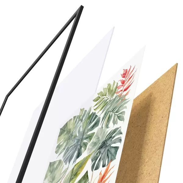 De poster bestaat uit een frame, plexiglas, geprinte afbeelding en spaanplaat achterkant. De poster kan meteen aan de muur worden gehangen dankzij de bevestigingen op de achterkant.