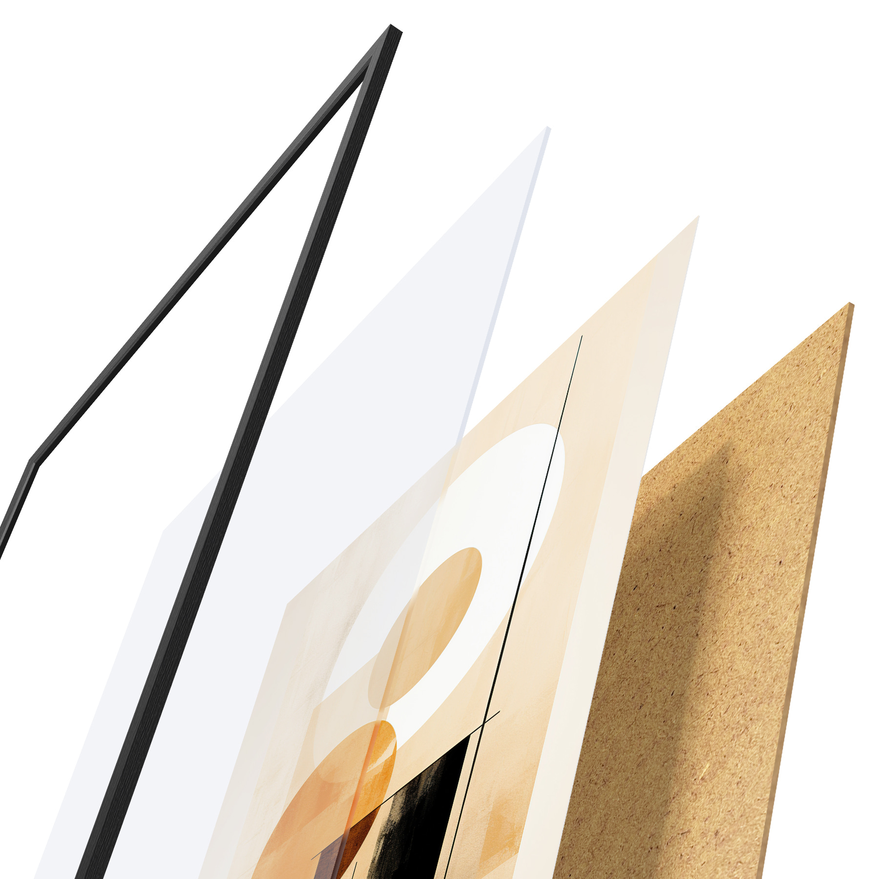 De poster bestaat uit een frame, plexiglas, geprinte afbeelding en spaanplaat achterkant. De poster kan meteen aan de muur worden gehangen dankzij de bevestigingen op de achterkant.