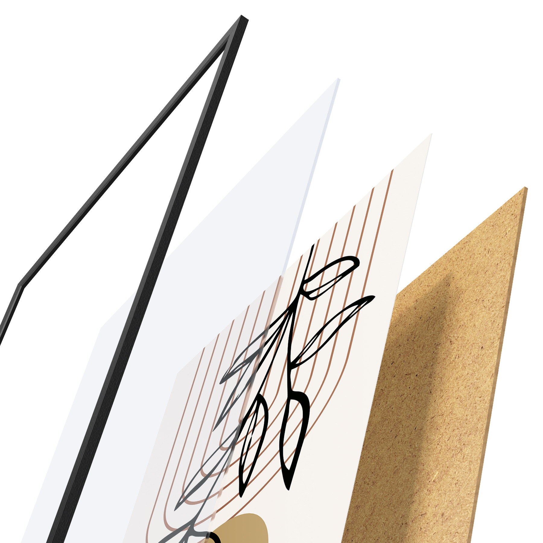 De poster bestaat uit een frame, plexiglas, geprinte afbeelding en spaanplaat achterkant. De poster kan meteen aan de muur worden gehangen dankzij de bevestigingen op de achterkant.
