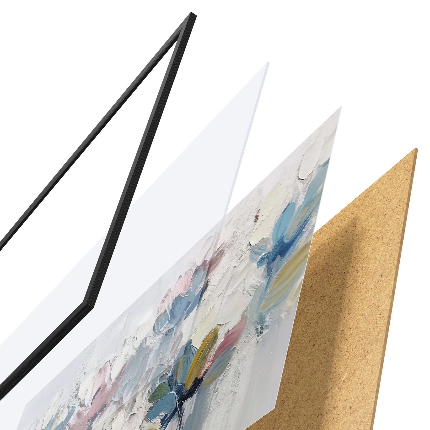 De poster bestaat uit een frame, plexiglas, geprinte afbeelding en spaanplaat achterkant. De poster kan meteen aan de muur worden gehangen dankzij de bevestigingen op de achterkant.