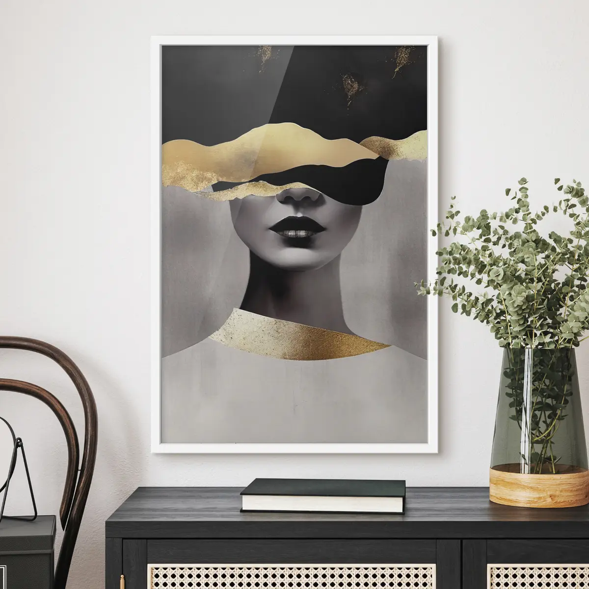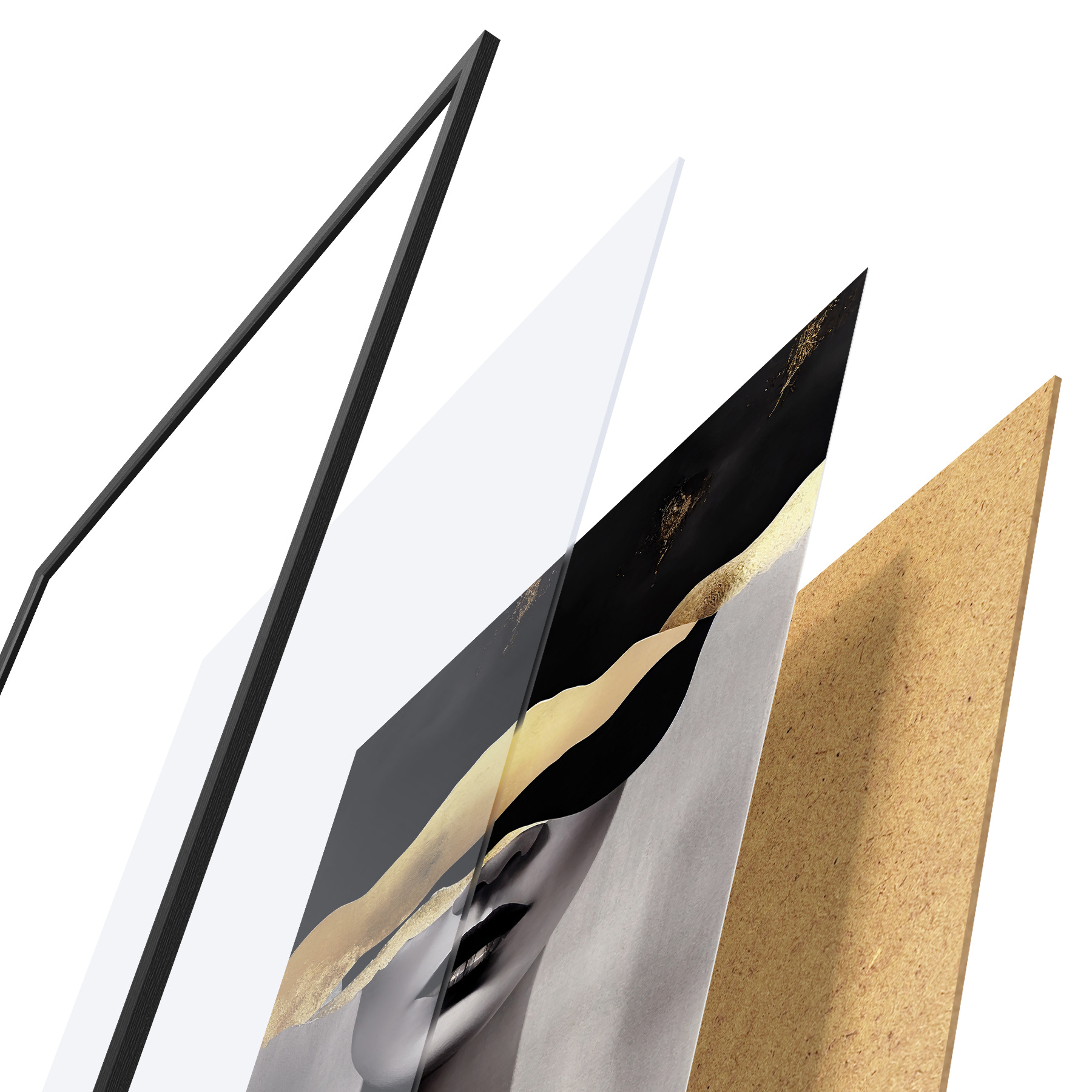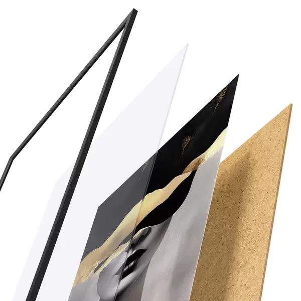 De poster bestaat uit een frame, plexiglas, geprinte afbeelding en spaanplaat achterkant. De poster kan meteen aan de muur worden gehangen dankzij de bevestigingen op de achterkant.