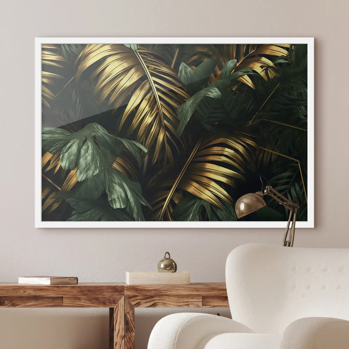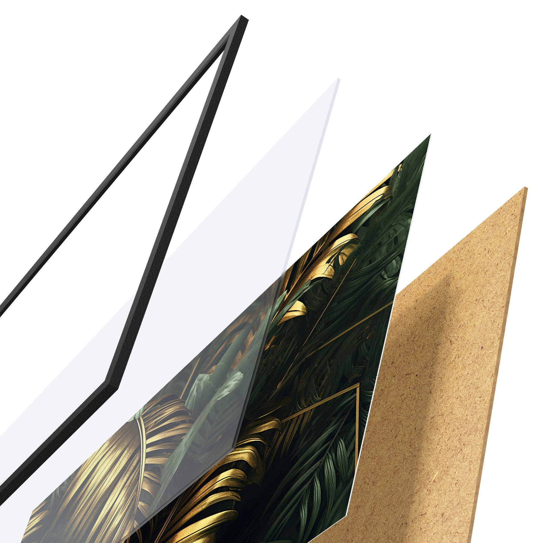 De poster bestaat uit een frame, plexiglas, geprinte afbeelding en spaanplaat achterkant. De poster kan meteen aan de muur worden gehangen dankzij de bevestigingen op de achterkant.
