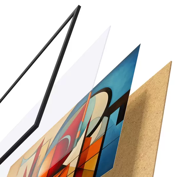 De poster bestaat uit een frame, plexiglas, geprinte afbeelding en spaanplaat achterkant. De poster kan meteen aan de muur worden gehangen dankzij de bevestigingen op de achterkant.