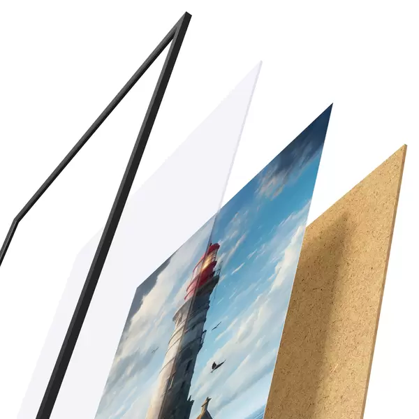 De poster bestaat uit een frame, plexiglas, geprinte afbeelding en spaanplaat achterkant. De poster kan meteen aan de muur worden gehangen dankzij de bevestigingen op de achterkant.