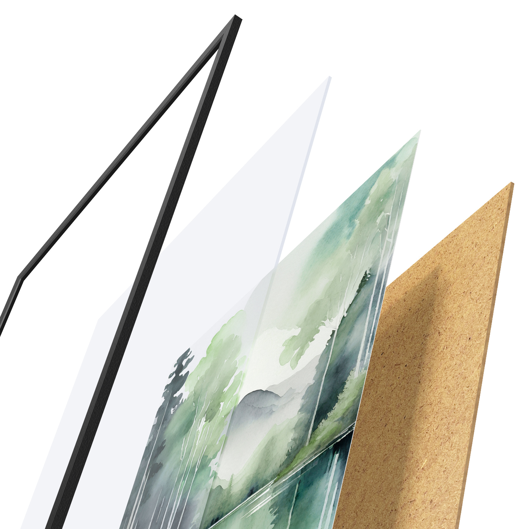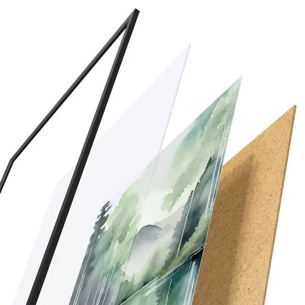 De poster bestaat uit een frame, plexiglas, geprinte afbeelding en spaanplaat achterkant. De poster kan meteen aan de muur worden gehangen dankzij de bevestigingen op de achterkant.