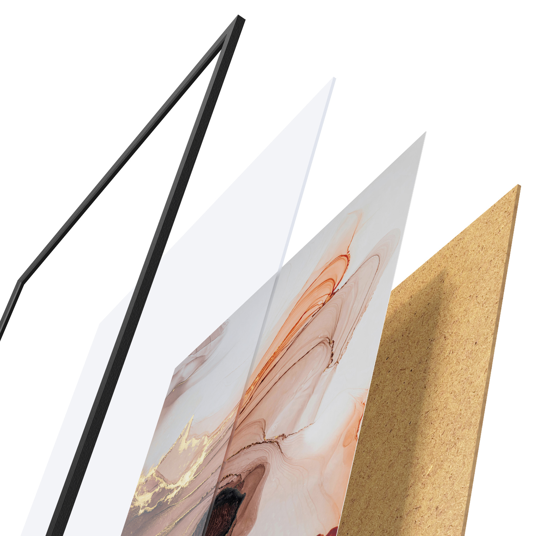 De poster bestaat uit een frame, plexiglas, geprinte afbeelding en spaanplaat achterkant. De poster kan meteen aan de muur worden gehangen dankzij de bevestigingen op de achterkant.