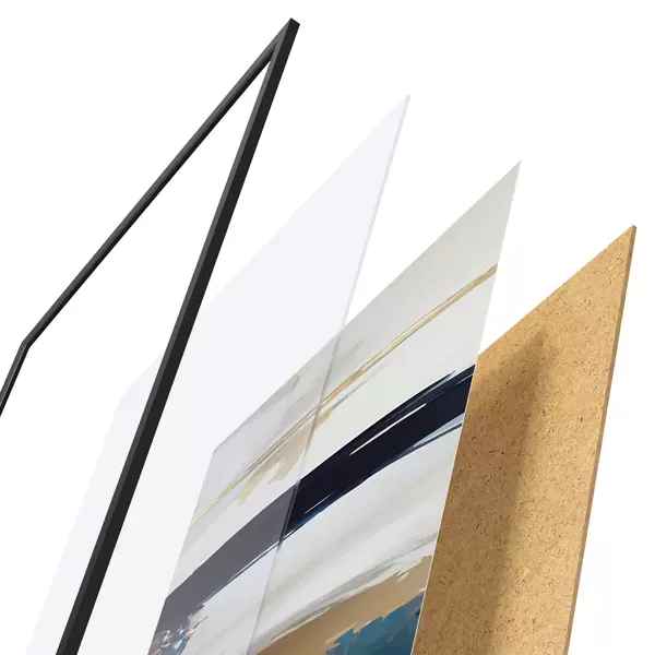 De poster bestaat uit een frame, plexiglas, geprinte afbeelding en spaanplaat achterkant. De poster kan meteen aan de muur worden gehangen dankzij de bevestigingen op de achterkant.