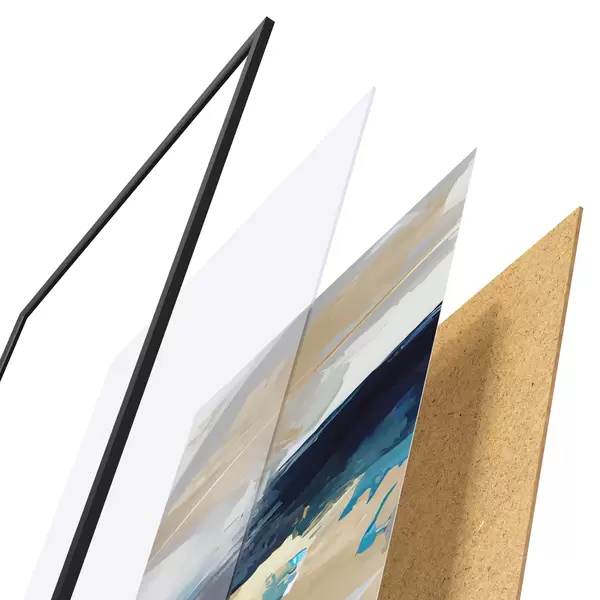 De poster bestaat uit een frame, plexiglas, geprinte afbeelding en spaanplaat achterkant. De poster kan meteen aan de muur worden gehangen dankzij de bevestigingen op de achterkant.