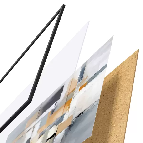 De poster bestaat uit een frame, plexiglas, geprinte afbeelding en spaanplaat achterkant. De poster kan meteen aan de muur worden gehangen dankzij de bevestigingen op de achterkant.