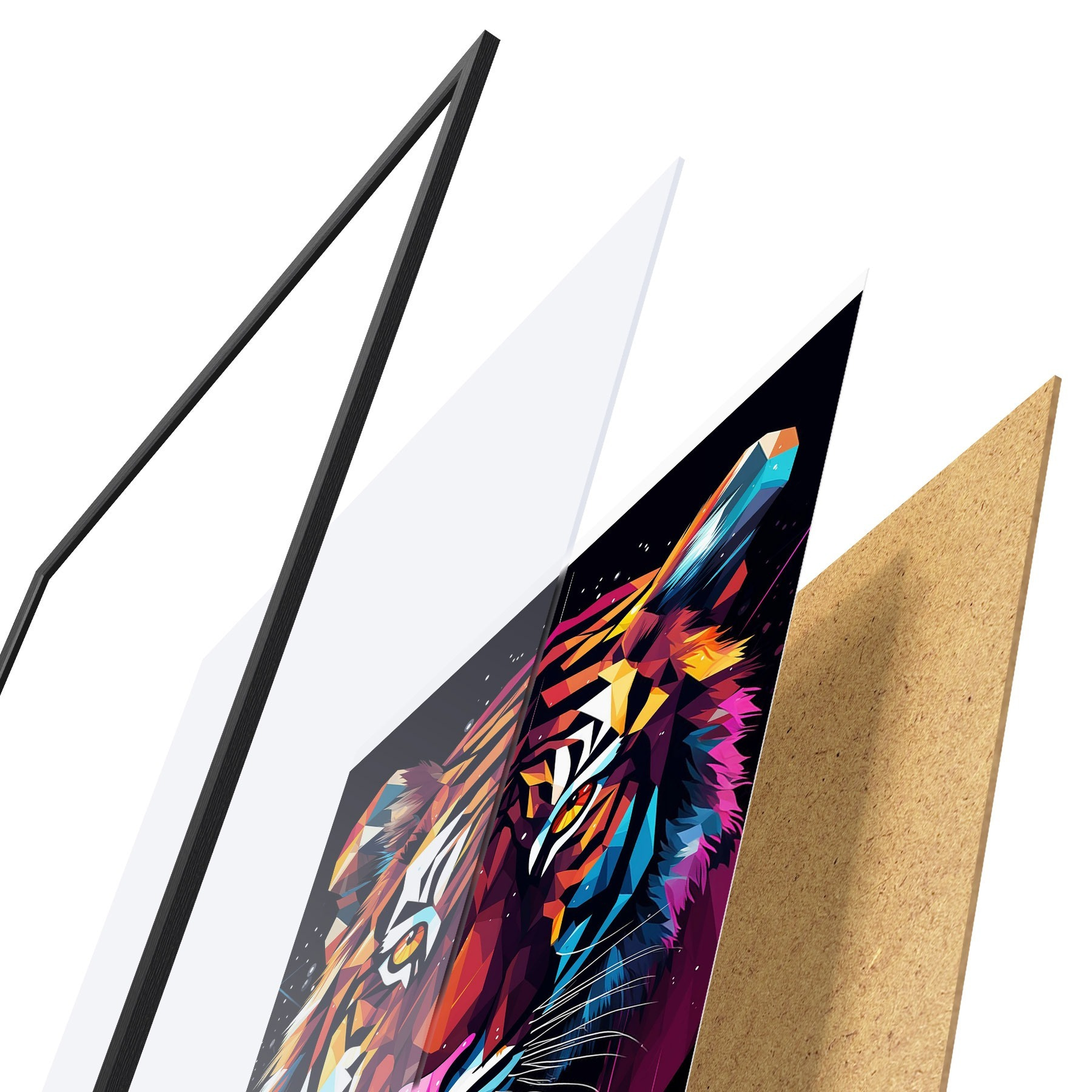 De poster bestaat uit een frame, plexiglas, geprinte afbeelding en spaanplaat achterkant. De poster kan meteen aan de muur worden gehangen dankzij de bevestigingen op de achterkant.