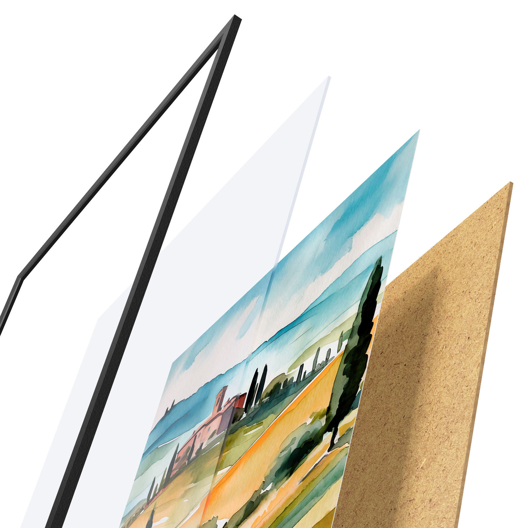 De poster bestaat uit een frame, plexiglas, geprinte afbeelding en spaanplaat achterkant. De poster kan meteen aan de muur worden gehangen dankzij de bevestigingen op de achterkant.
