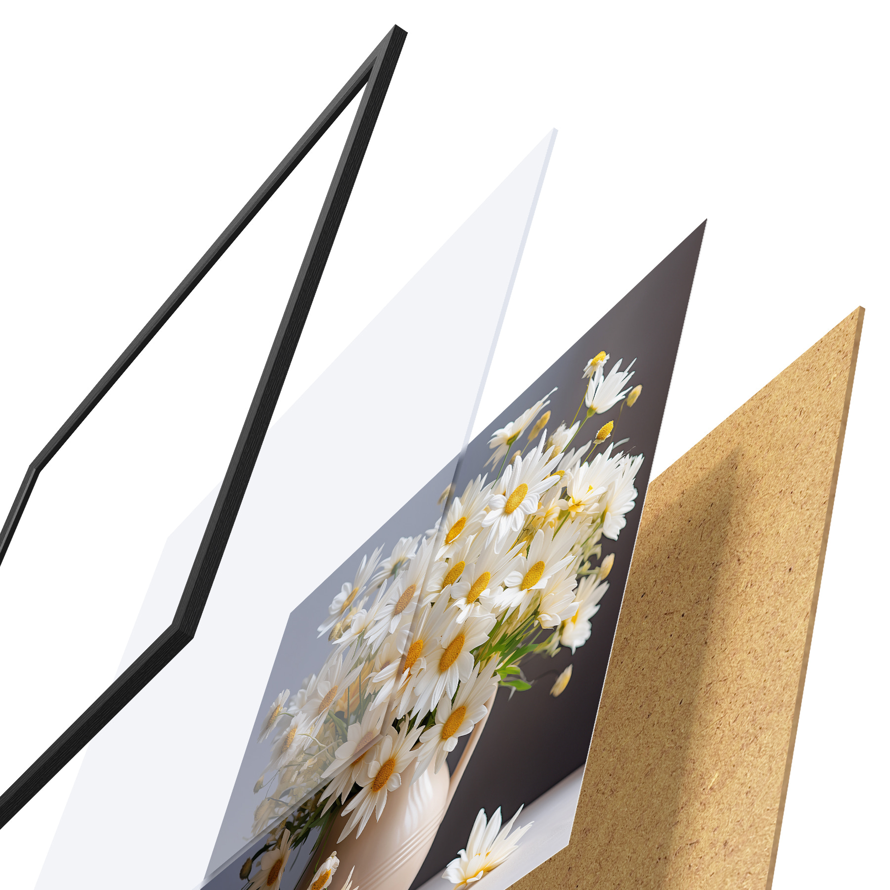 De poster bestaat uit een frame, plexiglas, geprinte afbeelding en spaanplaat achterkant. De poster kan meteen aan de muur worden gehangen dankzij de bevestigingen op de achterkant.
