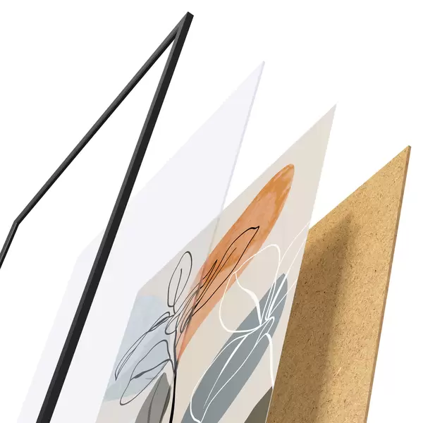 De poster bestaat uit een frame, plexiglas, geprinte afbeelding en spaanplaat achterkant. De poster kan meteen aan de muur worden gehangen dankzij de bevestigingen op de achterkant.