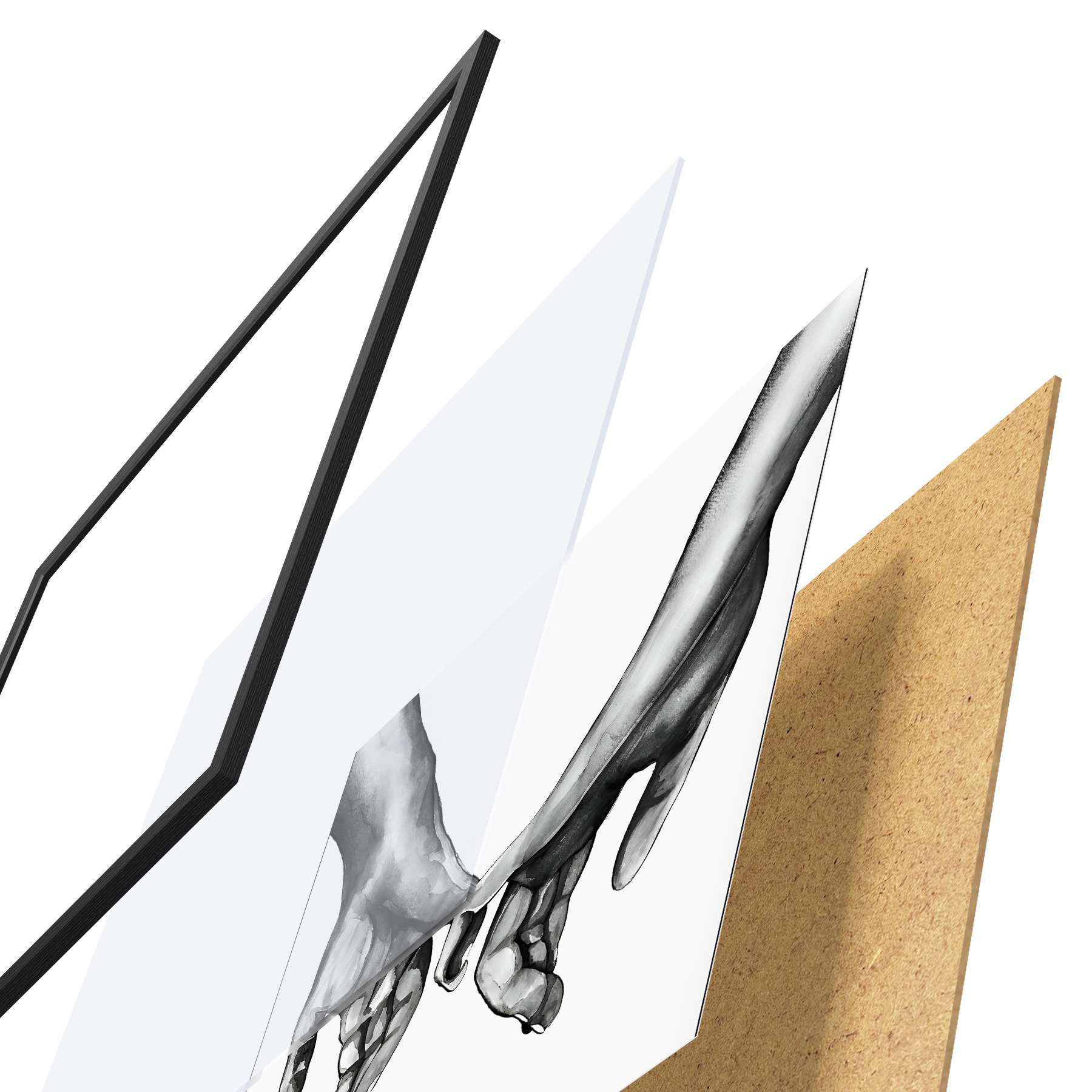 De poster bestaat uit een frame, plexiglas, geprinte afbeelding en spaanplaat achterkant. De poster kan meteen aan de muur worden gehangen dankzij de bevestigingen op de achterkant.