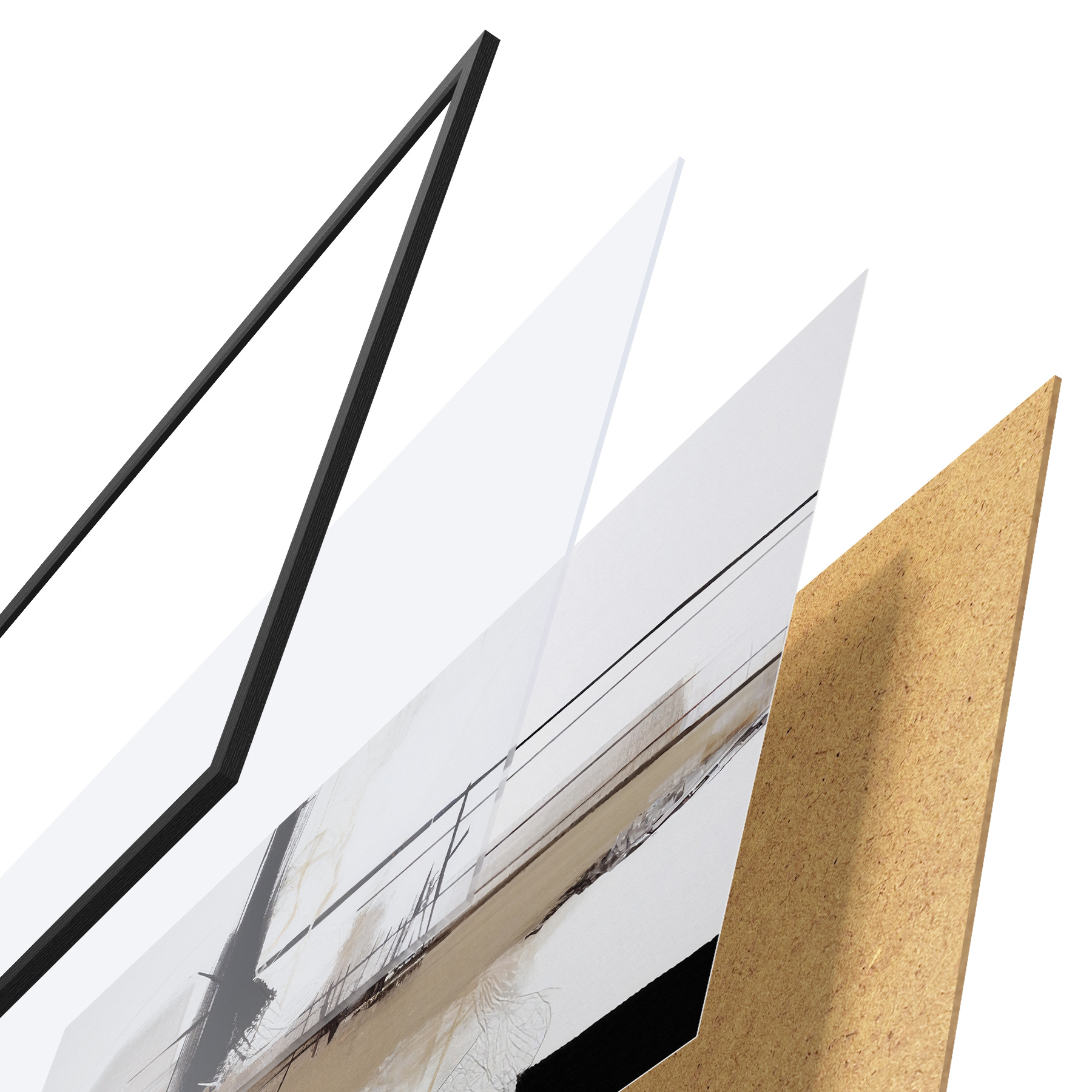 De poster bestaat uit een frame, plexiglas, geprinte afbeelding en spaanplaat achterkant. De poster kan meteen aan de muur worden gehangen dankzij de bevestigingen op de achterkant.