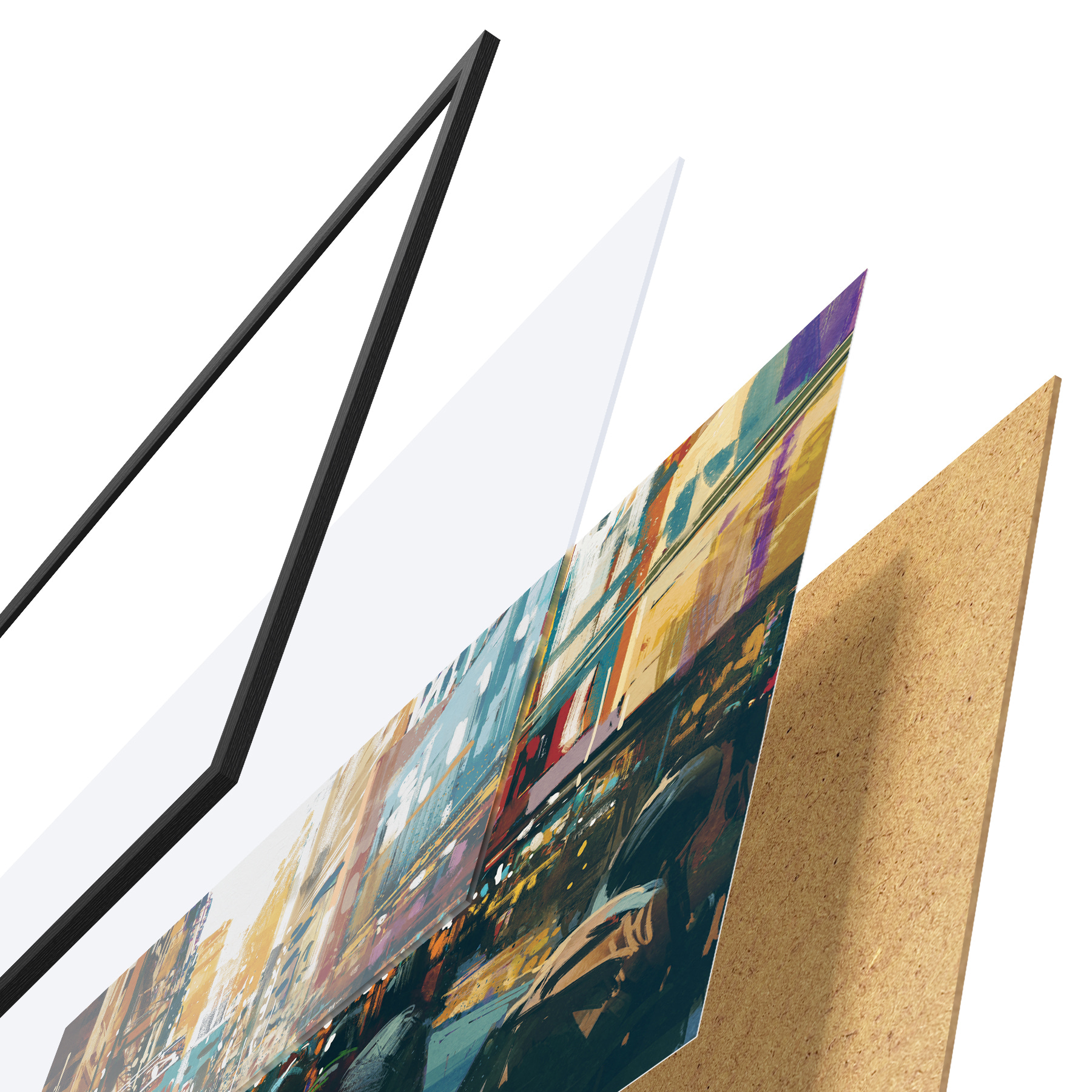 De poster bestaat uit een frame, plexiglas, geprinte afbeelding en spaanplaat achterkant. De poster kan meteen aan de muur worden gehangen dankzij de bevestigingen op de achterkant.