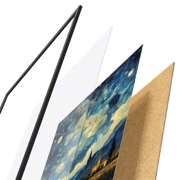 De poster bestaat uit een frame, plexiglas, geprinte afbeelding en spaanplaat achterkant. De poster kan meteen aan de muur worden gehangen dankzij de bevestigingen op de achterkant.