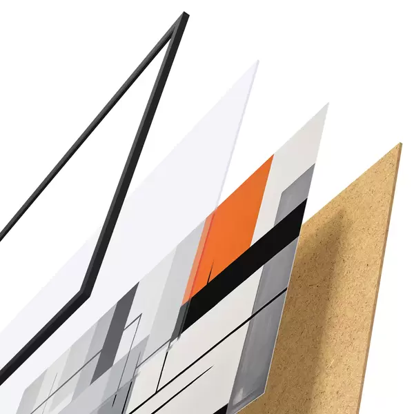 De poster bestaat uit een frame, plexiglas, geprinte afbeelding en spaanplaat achterkant. De poster kan meteen aan de muur worden gehangen dankzij de bevestigingen op de achterkant.