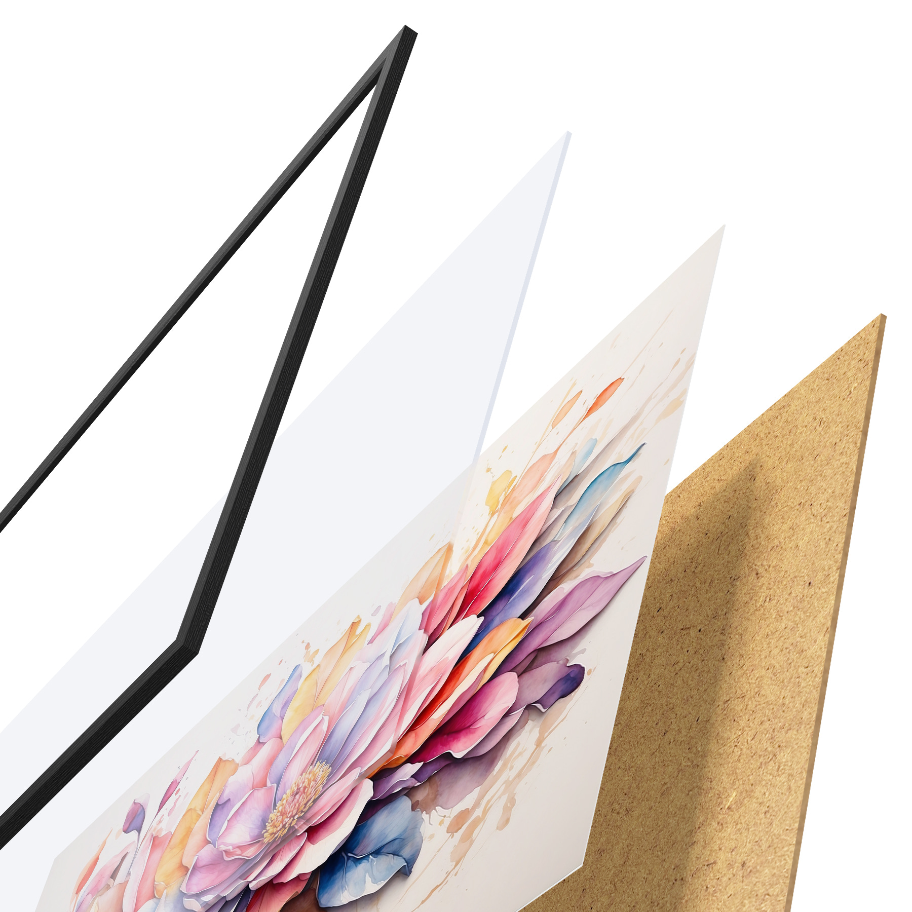 De poster bestaat uit een frame, plexiglas, geprinte afbeelding en spaanplaat achterkant. De poster kan meteen aan de muur worden gehangen dankzij de bevestigingen op de achterkant.