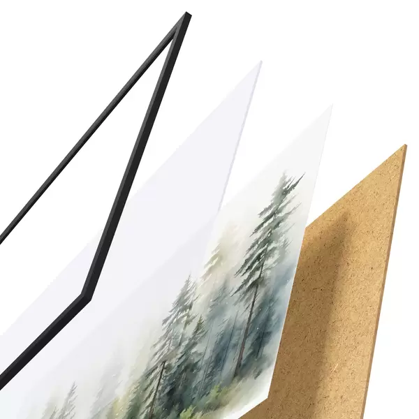 De poster bestaat uit een frame, plexiglas, geprinte afbeelding en spaanplaat achterkant. De poster kan meteen aan de muur worden gehangen dankzij de bevestigingen op de achterkant.