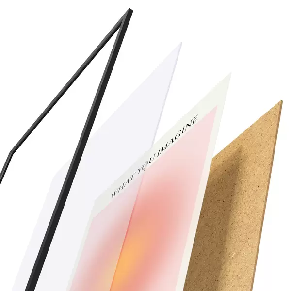 De poster bestaat uit een frame, plexiglas, geprinte afbeelding en spaanplaat achterkant. De poster kan meteen aan de muur worden gehangen dankzij de bevestigingen op de achterkant.