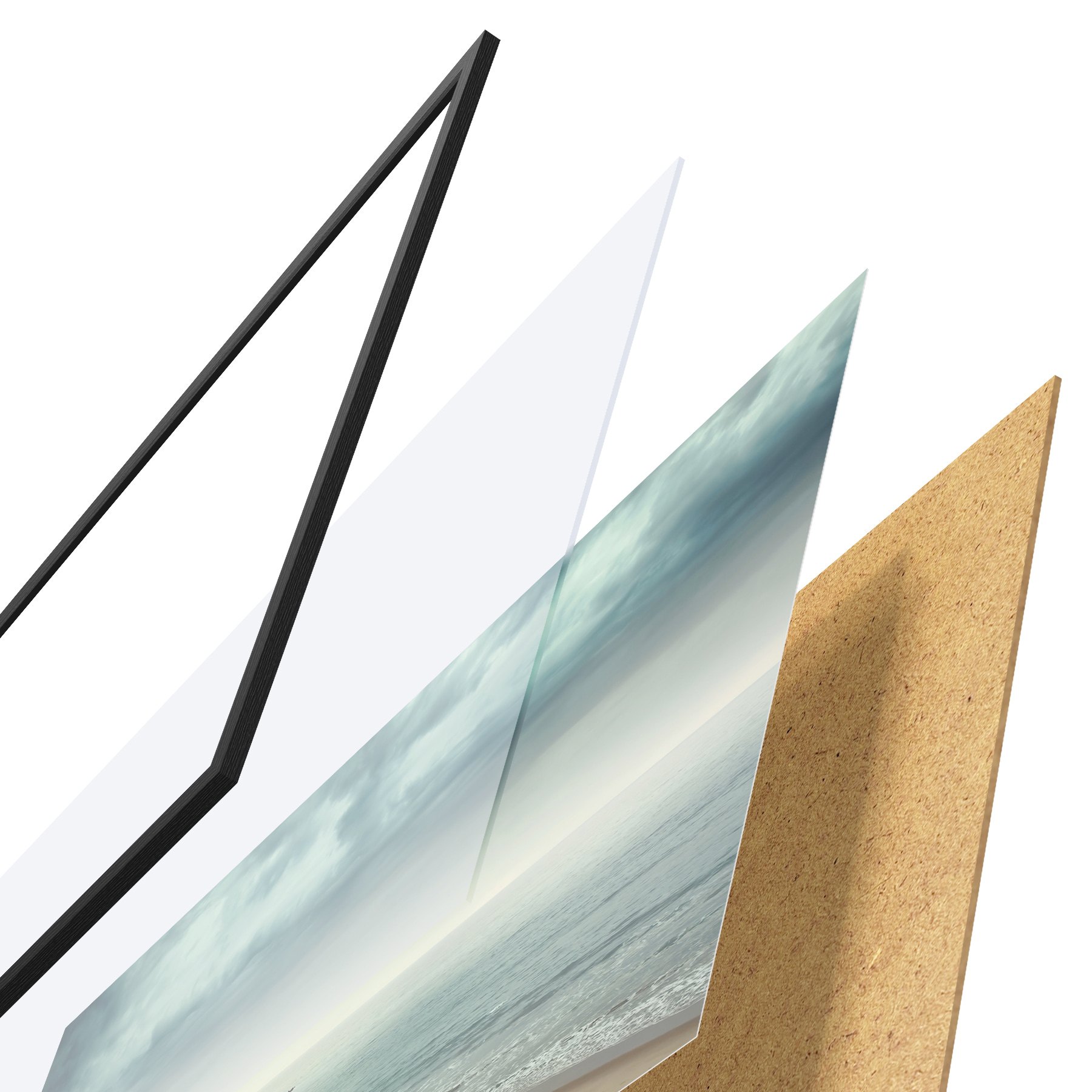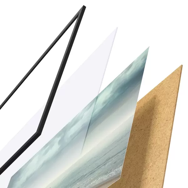 De poster bestaat uit een frame, plexiglas, geprinte afbeelding en spaanplaat achterkant. De poster kan meteen aan de muur worden gehangen dankzij de bevestigingen op de achterkant.