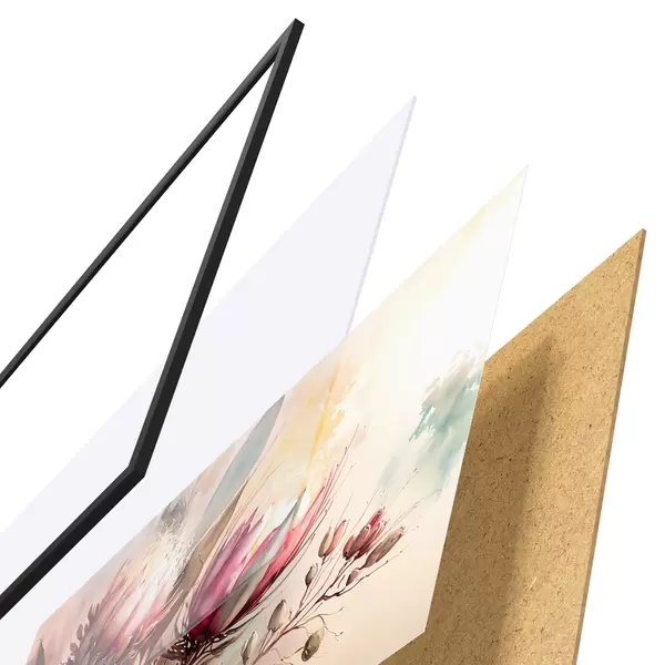 De poster bestaat uit een frame, plexiglas, geprinte afbeelding en spaanplaat achterkant. De poster kan meteen aan de muur worden gehangen dankzij de bevestigingen op de achterkant.