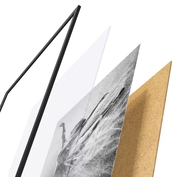 De poster bestaat uit een frame, plexiglas, geprinte afbeelding en spaanplaat achterkant. De poster kan meteen aan de muur worden gehangen dankzij de bevestigingen op de achterkant.