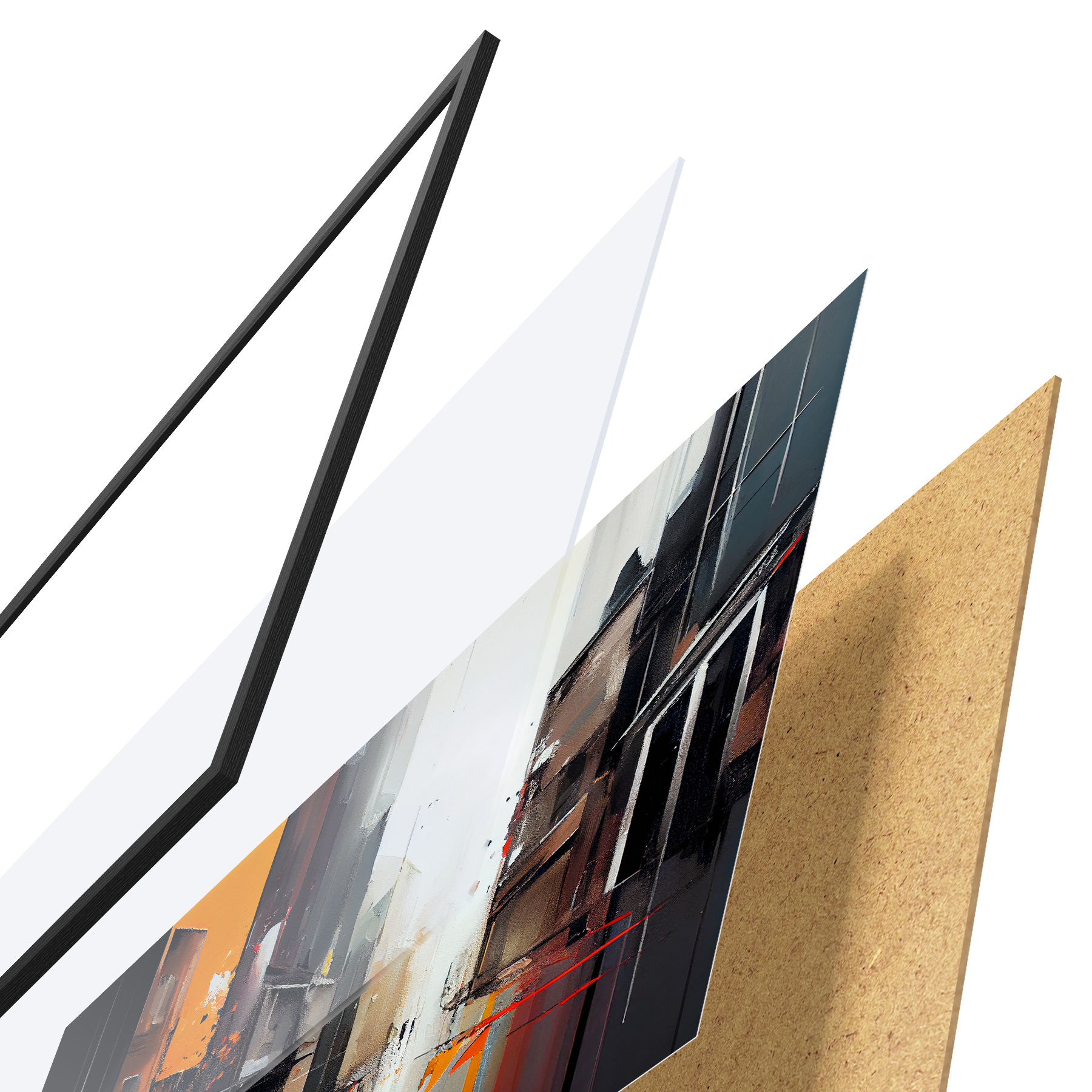 De poster bestaat uit een frame, plexiglas, geprinte afbeelding en spaanplaat achterkant. De poster kan meteen aan de muur worden gehangen dankzij de bevestigingen op de achterkant.