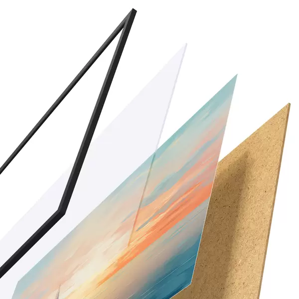 De poster bestaat uit een frame, plexiglas, geprinte afbeelding en spaanplaat achterkant. De poster kan meteen aan de muur worden gehangen dankzij de bevestigingen op de achterkant.
