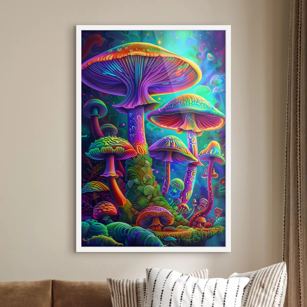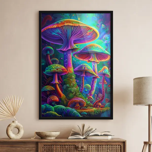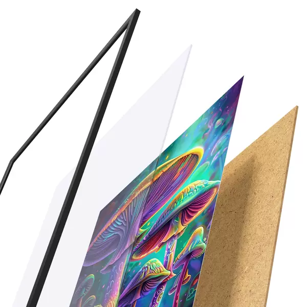 De poster bestaat uit een frame, plexiglas, geprinte afbeelding en spaanplaat achterkant. De poster kan meteen aan de muur worden gehangen dankzij de bevestigingen op de achterkant.