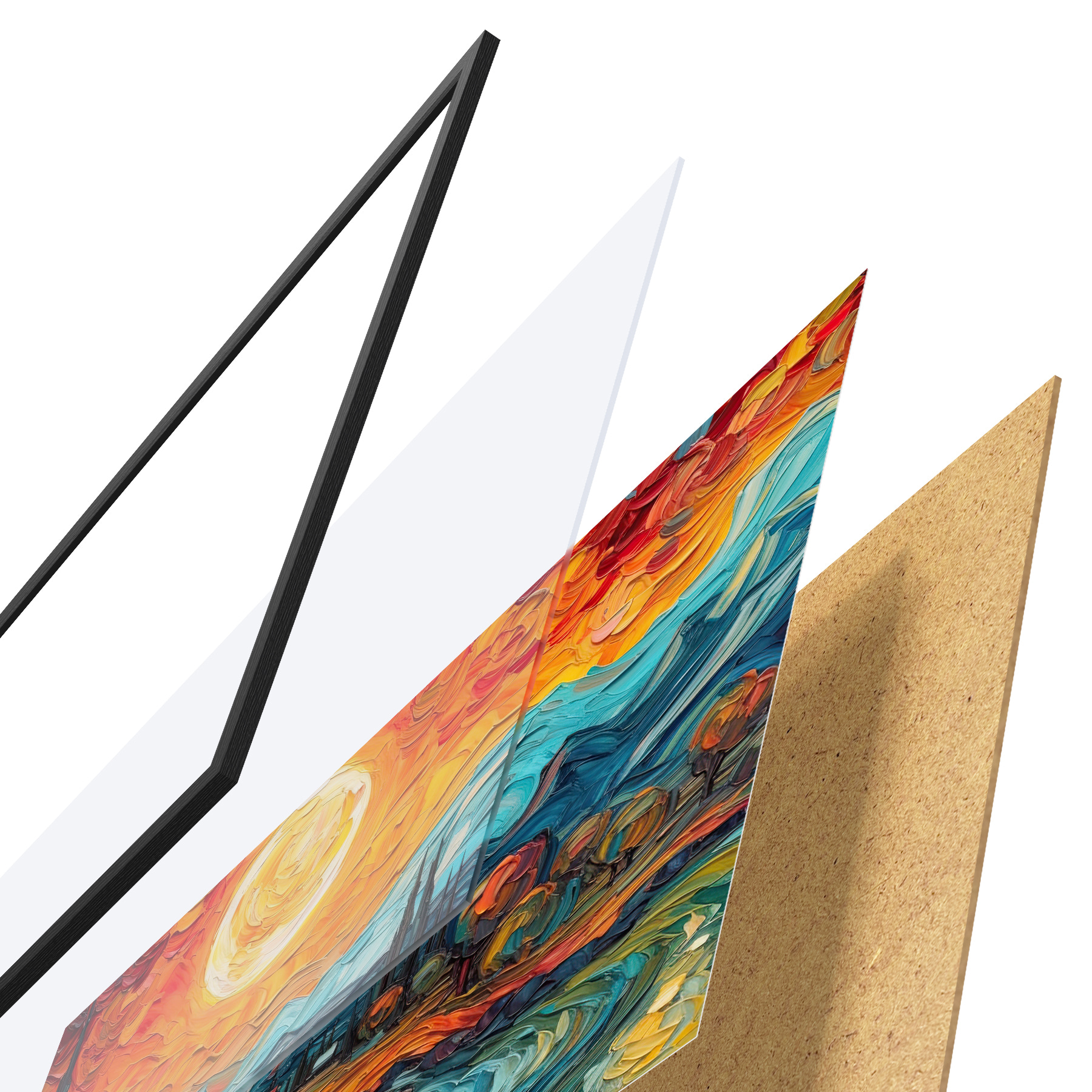 De poster bestaat uit een frame, plexiglas, geprinte afbeelding en spaanplaat achterkant. De poster kan meteen aan de muur worden gehangen dankzij de bevestigingen op de achterkant.
