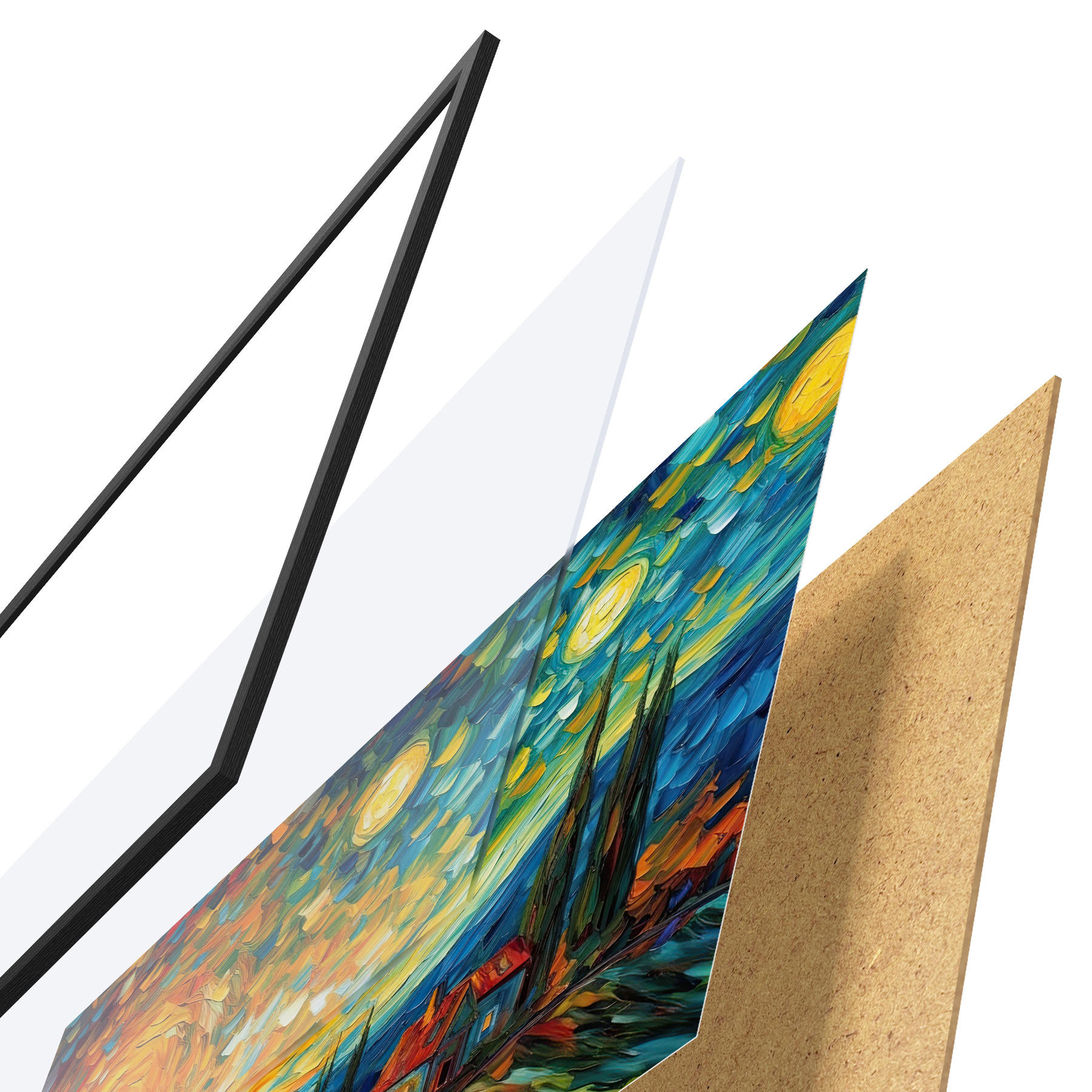 De poster bestaat uit een frame, plexiglas, geprinte afbeelding en spaanplaat achterkant. De poster kan meteen aan de muur worden gehangen dankzij de bevestigingen op de achterkant.
