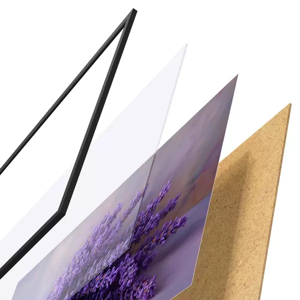 De poster bestaat uit een frame, plexiglas, geprinte afbeelding en spaanplaat achterkant. De poster kan meteen aan de muur worden gehangen dankzij de bevestigingen op de achterkant.