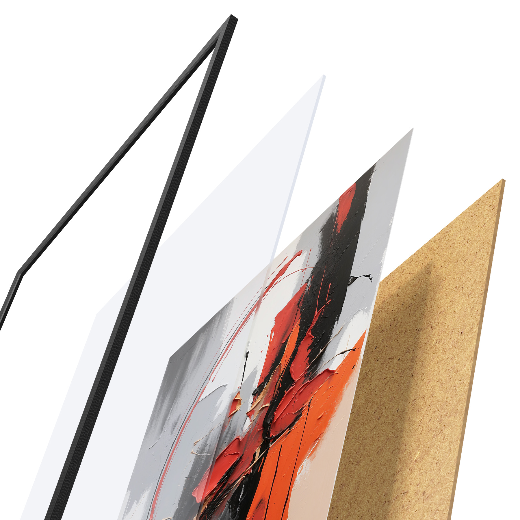 De poster bestaat uit een frame, plexiglas, geprinte afbeelding en spaanplaat achterkant. De poster kan meteen aan de muur worden gehangen dankzij de bevestigingen op de achterkant.