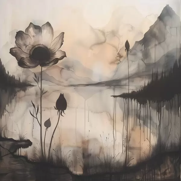Poster Afbeelding van een bloem en een meer f38161