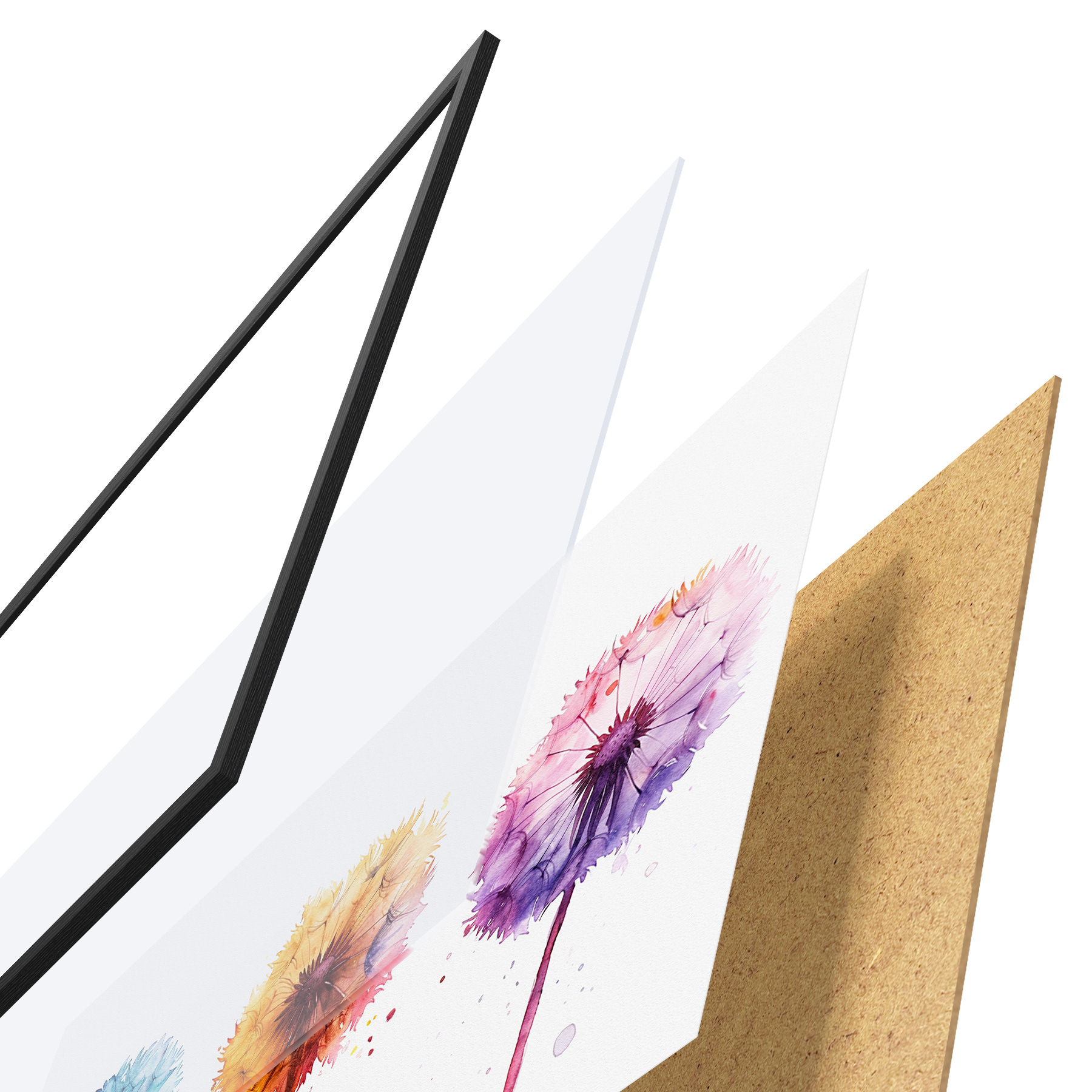 De poster bestaat uit een frame, plexiglas, geprinte afbeelding en spaanplaat achterkant. De poster kan meteen aan de muur worden gehangen dankzij de bevestigingen op de achterkant.