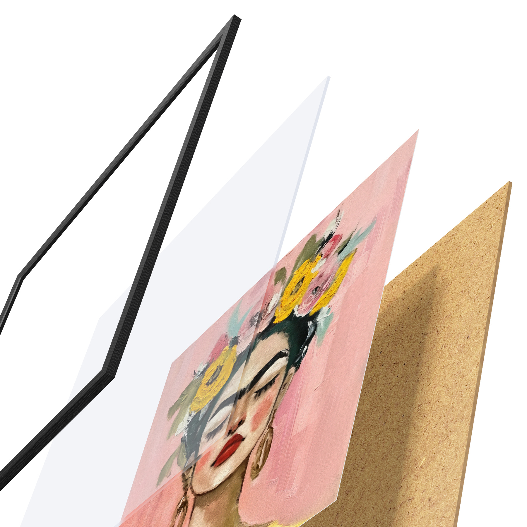 De poster bestaat uit een frame, plexiglas, geprinte afbeelding en spaanplaat achterkant. De poster kan meteen aan de muur worden gehangen dankzij de bevestigingen op de achterkant.