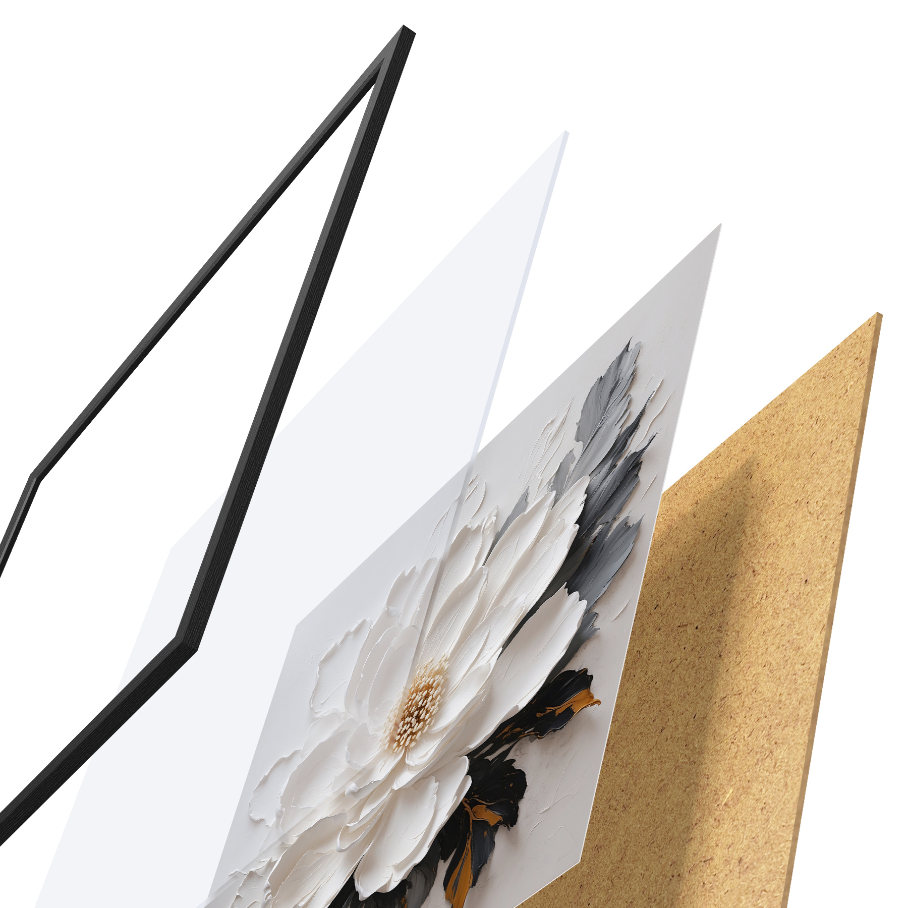 De poster bestaat uit een frame, plexiglas, geprinte afbeelding en spaanplaat achterkant. De poster kan meteen aan de muur worden gehangen dankzij de bevestigingen op de achterkant.