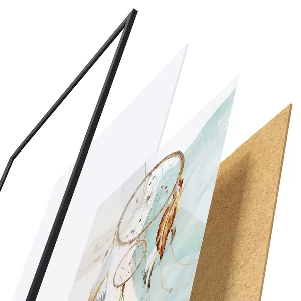 De poster bestaat uit een frame, plexiglas, geprinte afbeelding en spaanplaat achterkant. De poster kan meteen aan de muur worden gehangen dankzij de bevestigingen op de achterkant.