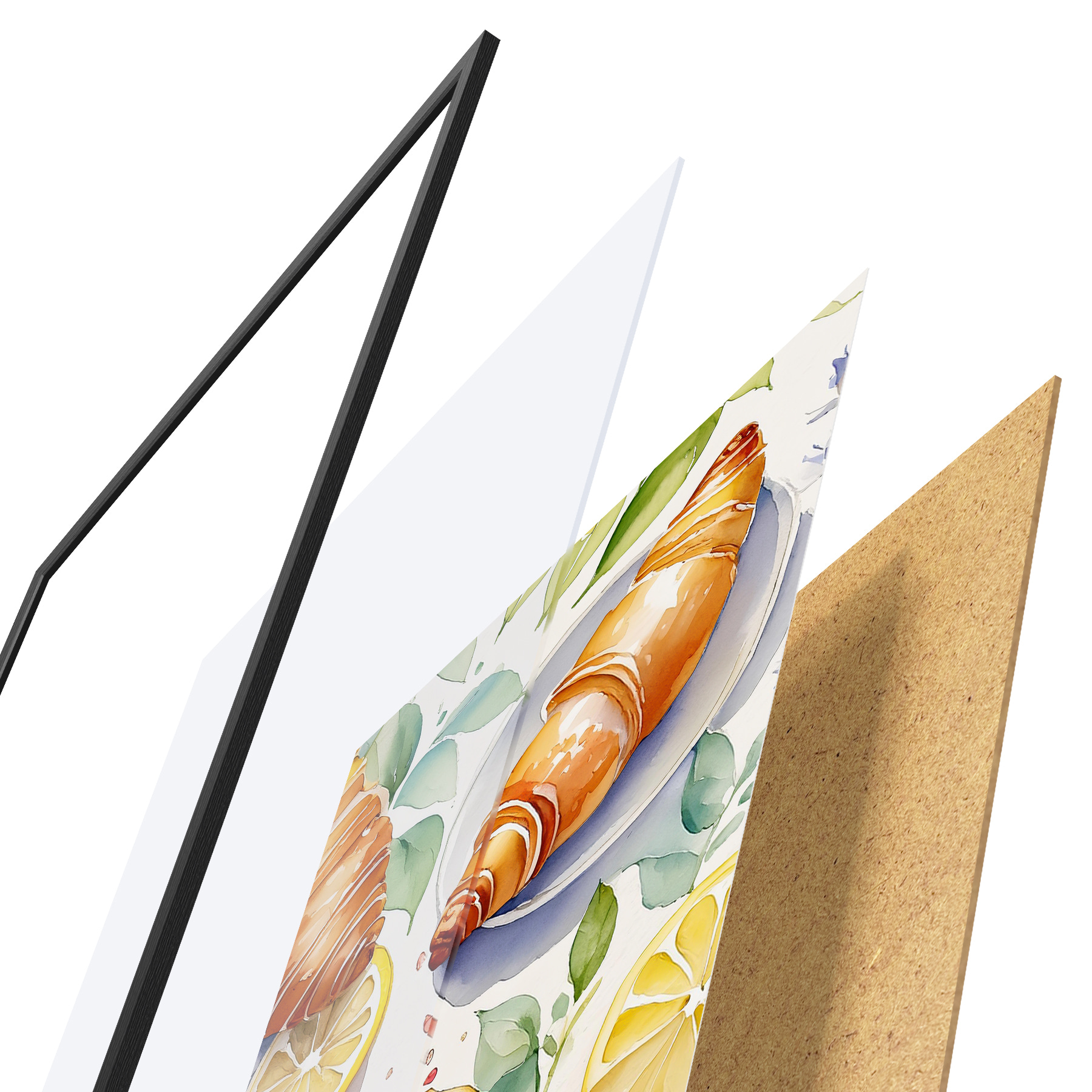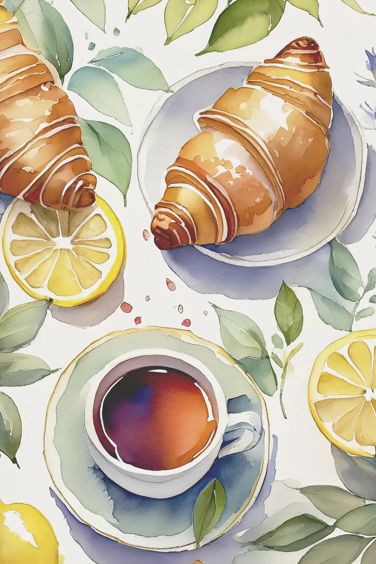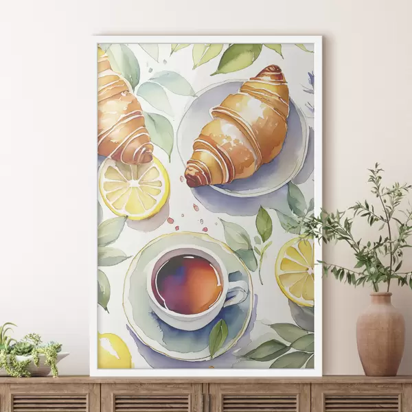 Poster Croissant aquarel, kopje thee, ontbijt, citroenen, rustieke stijl Nr f38389