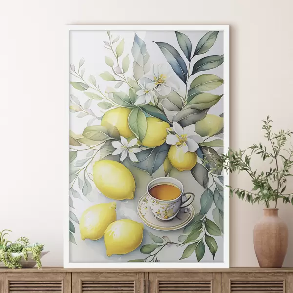 Poster Citroenen en bloemen, aquarel, ontbijt, kopje thee, boheemse stijl Nr f38403