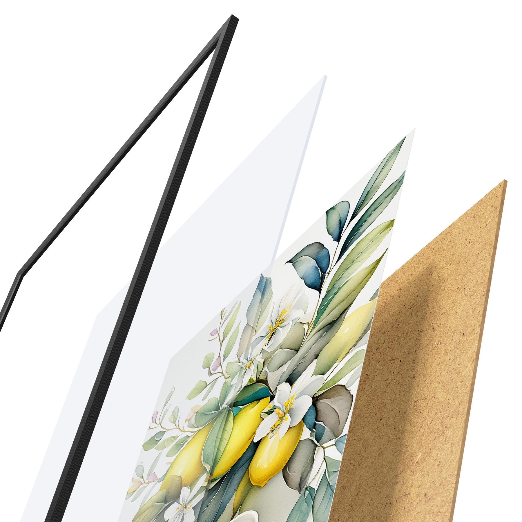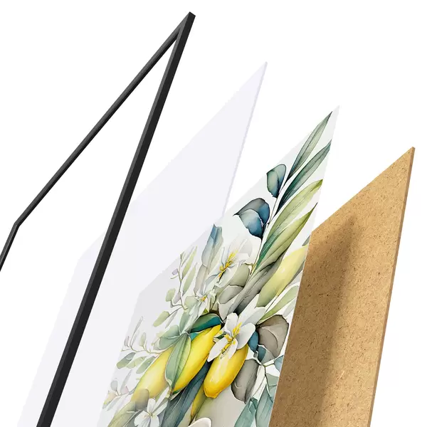 De poster bestaat uit een frame, plexiglas, geprinte afbeelding en spaanplaat achterkant. De poster kan meteen aan de muur worden gehangen dankzij de bevestigingen op de achterkant.