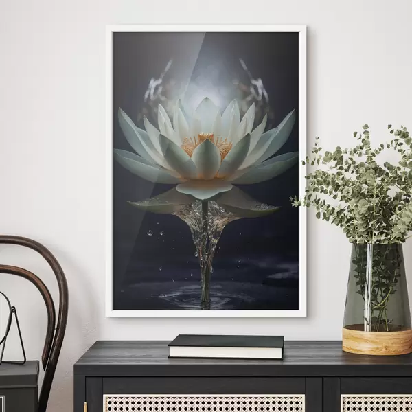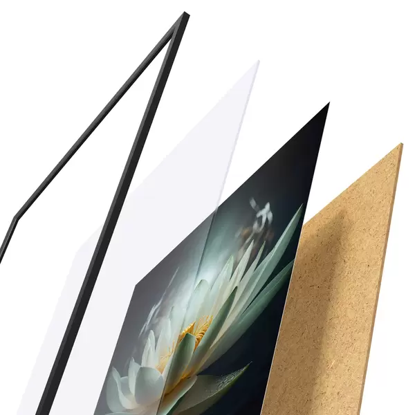 De poster bestaat uit een frame, plexiglas, geprinte afbeelding en spaanplaat achterkant. De poster kan meteen aan de muur worden gehangen dankzij de bevestigingen op de achterkant.