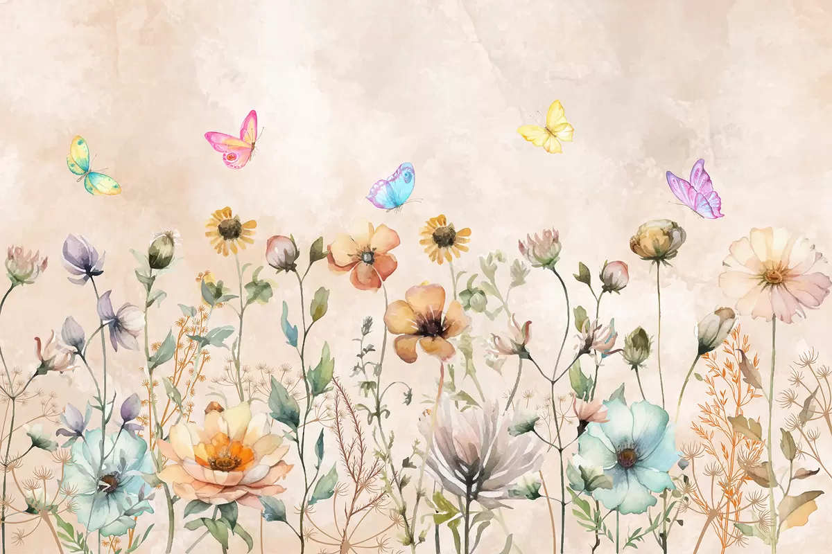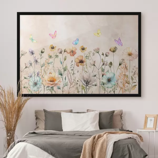 Poster wilde bloemen met aquarellen, heldere vlinders, pastelkleuren Nr f38441