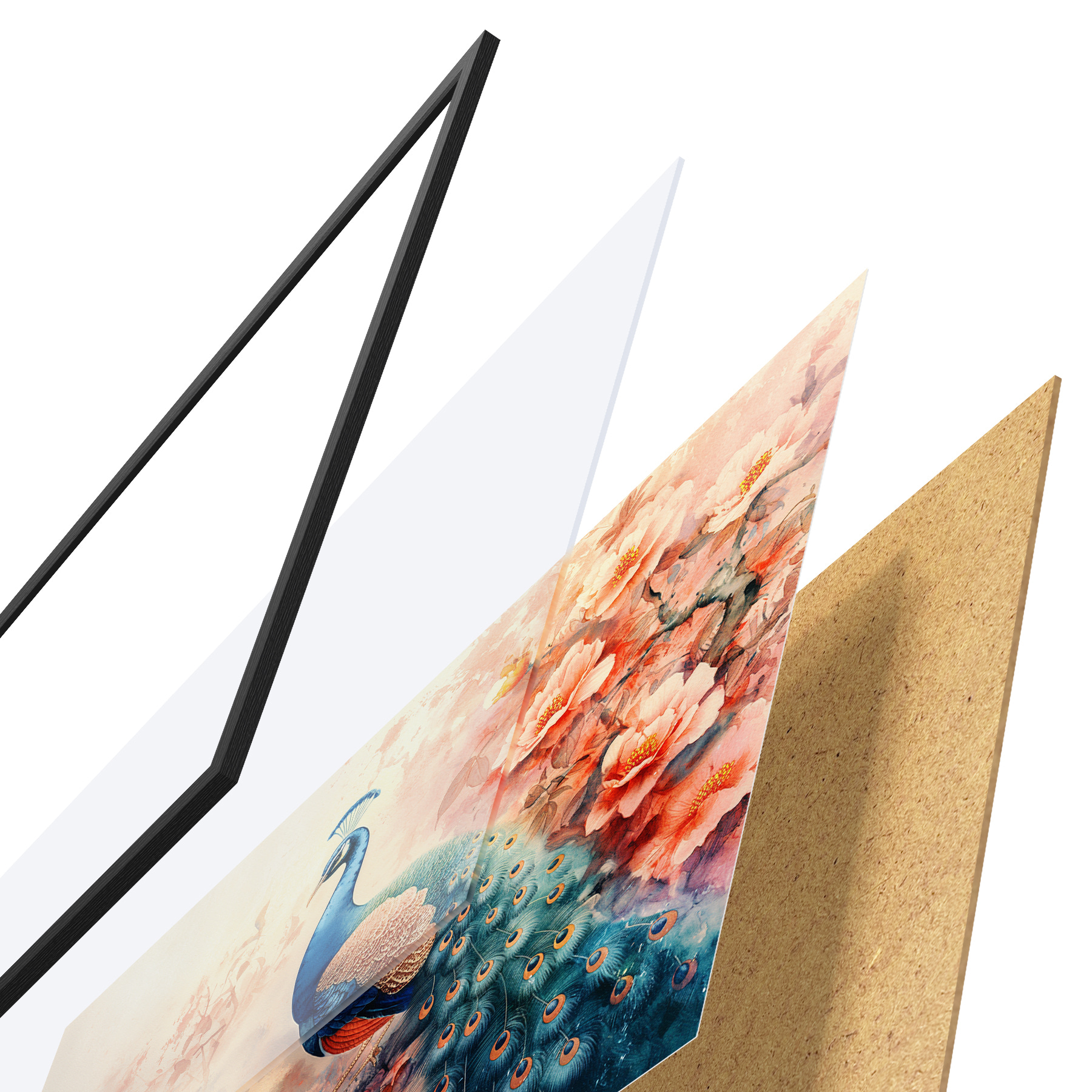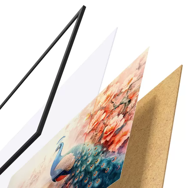 De poster bestaat uit een frame, plexiglas, geprinte afbeelding en spaanplaat achterkant. De poster kan meteen aan de muur worden gehangen dankzij de bevestigingen op de achterkant.