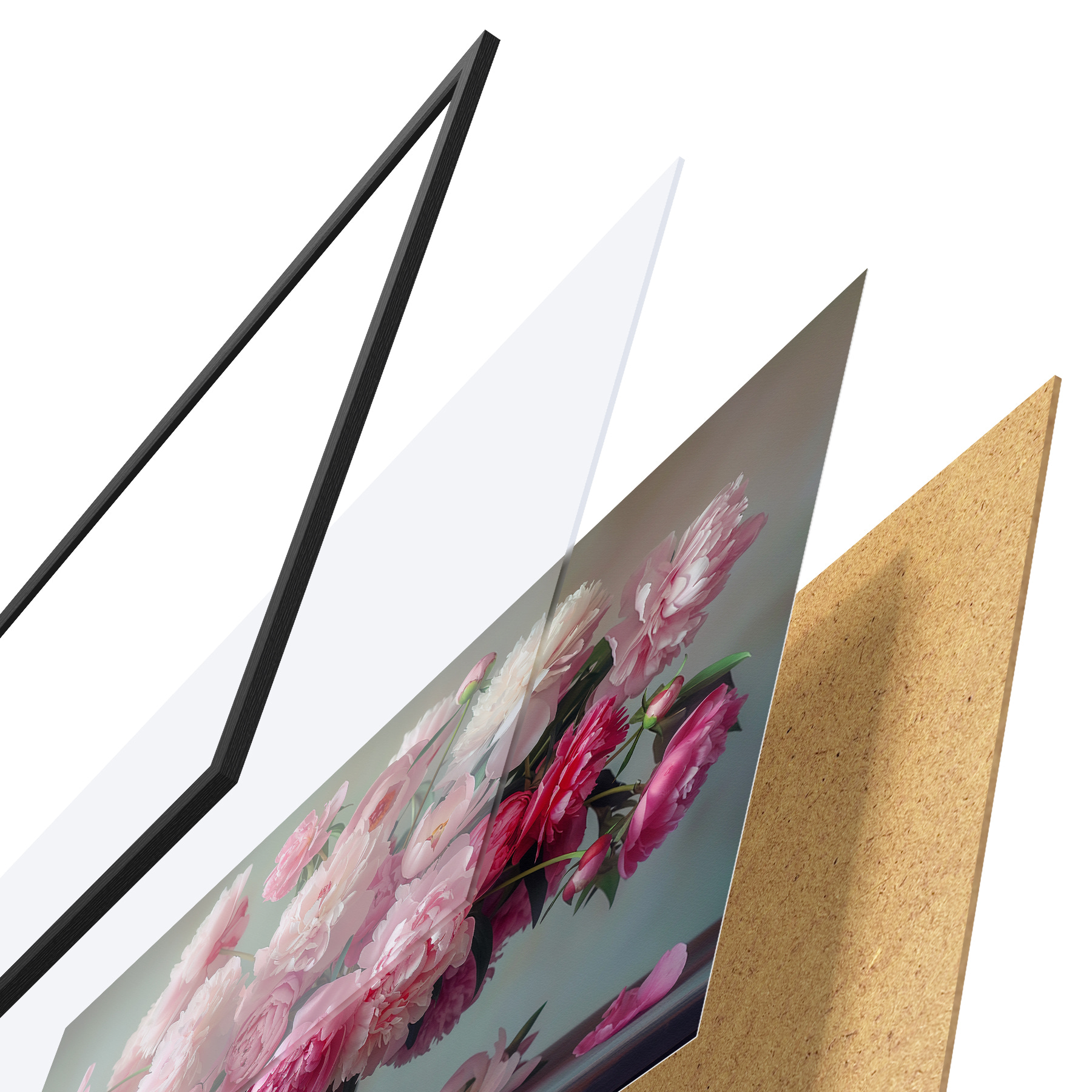 De poster bestaat uit een frame, plexiglas, geprinte afbeelding en spaanplaat achterkant. De poster kan meteen aan de muur worden gehangen dankzij de bevestigingen op de achterkant.