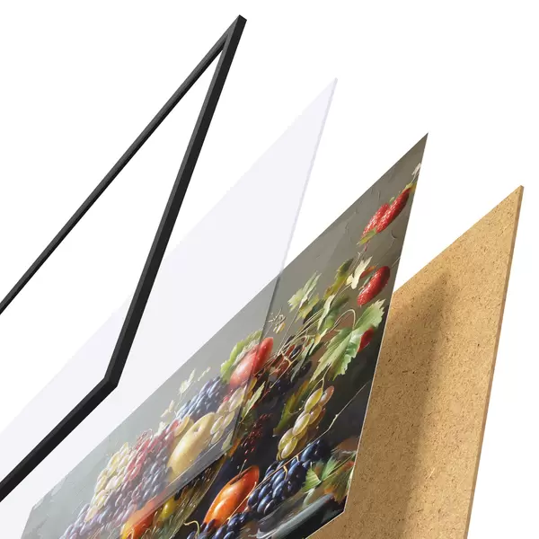 De poster bestaat uit een frame, plexiglas, geprinte afbeelding en spaanplaat achterkant. De poster kan meteen aan de muur worden gehangen dankzij de bevestigingen op de achterkant.